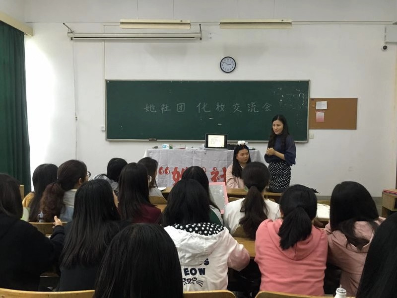 交流会以两位十分接地气的学姐现场演示她们的化妆流程作为开场,经过两年多的练习,她们已经掌握了较为娴熟的手法,配上幽默风趣的解说,点燃了在场同学们的热情。化完妆的学姐们,脸上洋溢着自信、阳光的笑容,展现出青春学子的风采。通过学姐的展示,大家更加迫切地想要进行更加专业的学习,找到适合自己的风格。