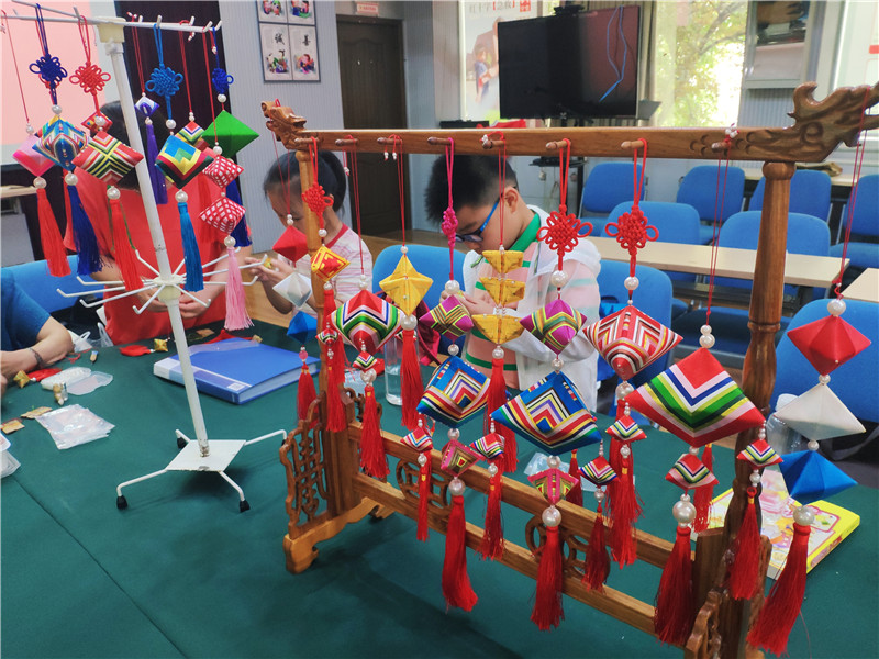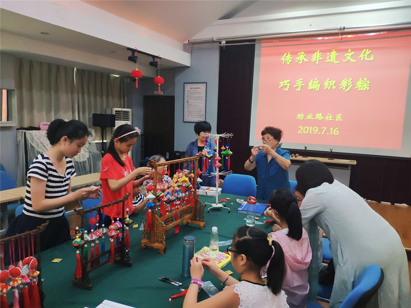 随着盛夏的来临,社区青少年迎来了快乐的暑期生活,为了丰富社区青少年的暑期生活,培养他们的动手能力,同时也为了传承中国优秀民间文化艺术,7月16日下午,劝业路社区妇联开展了一期“传承非遗技艺 巧手编织彩粽”夏令营活动。 本次活动,社区邀请了80岁高龄的非遗传承人韩玉如老师,教小朋友们用纸片、彩线编织彩粽。青少年们在轻松的氛围中,在韩老师的耐心帮助下,充分发挥动手能力,编出了一个个绚丽多彩的手工粽。目前,彩粽已收入鼓楼区第三批非物质文化遗产名录,在区、街的共同支持下,劝业路社区专门设立了“韩玉如彩粽工作室”,每周二下午韩老师现场免费指导彩粽爱好者制作彩粽。韩老师在五十中学开设的彩粽制作兴趣班已举办了三届,本届报名参加兴趣班的学生多达500人。