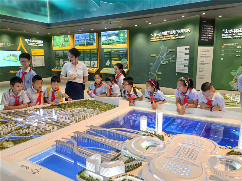 触摸显示屏用生动的影像资料,形象地展示出南京江北新区的背景、定位、区位优势等相关信息。参观过程中孩子们不断提出自己的疑问,同时也为未来之城的发展变迁而深深震撼。
