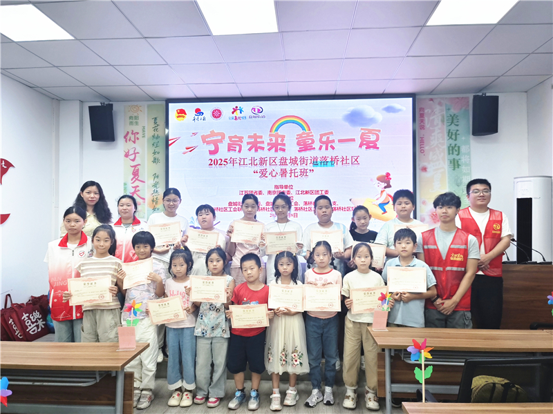 近日,江北新区盘城街道落桥社区爱心暑托班结营仪式在教室里温馨启幕。五彩斑斓的风车插在桌子上,微风拂过,叶片轻轻转动,仿佛在为这个夏天的相聚与离别伴奏,也见证着孩子们一个多月的成长与收获。