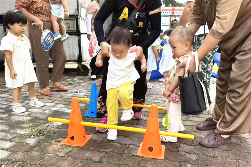 活动以“故事妈妈”开启,工作人员通过《好饿的毛毛虫》绘本带领亲子家庭进入互动场景,以生动讲述与立体道具引导宝宝触摸、辨认水果图案,家长积极参与。随后进入亲子游戏环节:“小球投投乐”与“趣味跳杆”,宝宝在家长协助下完成钻爬、跳跃动作,锻炼手部力量与肢体平衡感。现场,家长用手机记录成长瞬间,活动氛围温馨。