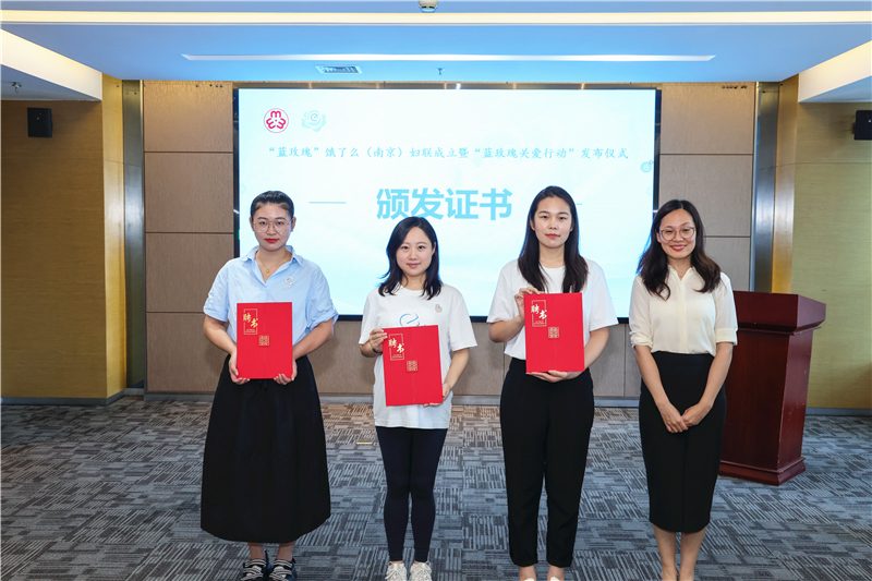 在“蓝玫瑰关爱行动”发布仪式上,女骑手关爱计划正式启动,将通过“健康护航、心理赋能、价值重塑”三大行动,为女骑手们提供多重服务。建邺高新区妇联主席郝瑞娜为新当选的主席、副主席颁发聘书。