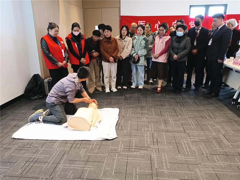 活动中,志愿者以理论授课、实操演练相结合的方式,重点对心脏骤停的预防、海姆立克急救法、心肺复苏、包扎止血、常见急症的处理方法等急救理论知识进行了讲解及互动演示。随后,居民们在老师们的指导下,从科学施救应遵循的“一评、二识、三呼、四救”急救流程四步法进行实操演练,让大家更快掌握了心肺复苏、人工呼吸技能及自动体外除颤仪(AED)的使用,用“石头、剪刀、布”的手势法快速找准位置让志愿者们学会了异物卡喉的急救方法。