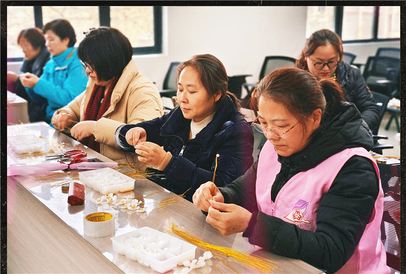 随后,在志愿者老师的专业指导下,大家一起进行手工玉兰花的制作。现场,大家通过穿花片、拧铁丝、定型等技法,将一朵朵玉兰花栩栩如生地“培育”出来。制作结束时,大家脸上洋溢着满满的成就感。这些精美的艺术品不仅展现了在场女性的巧手和智慧,也体现了大家对生活的热爱与创造力。