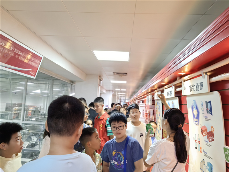 随后,孩子们走进生产车间参观可口可乐的生产过程。透过玻璃幕墙,可以看到各种各样正在运转的大型机器,可口可乐在全自动化的装置下冲瓶、灌装、加盖、传送,成百上千瓶可乐都在井然有序地生产中。