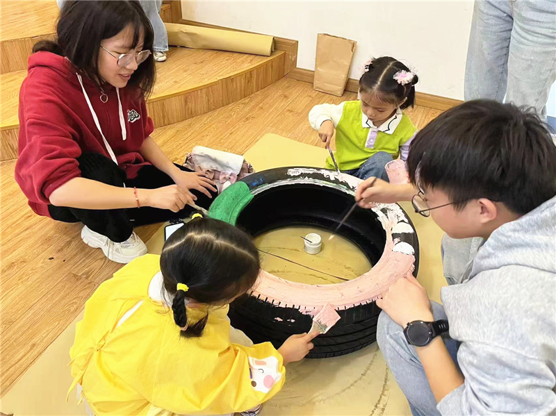 活动现场,巾帼志愿者们设计画稿,并准备好画笔和颜料,在废弃的轮胎上喷涂、勾线,尽情创意绘画。经过志愿者与居民们共同创作,很快赋予旧轮胎新的生命,有效减少废旧物品对环境的额外压力,提高资源再利用率。