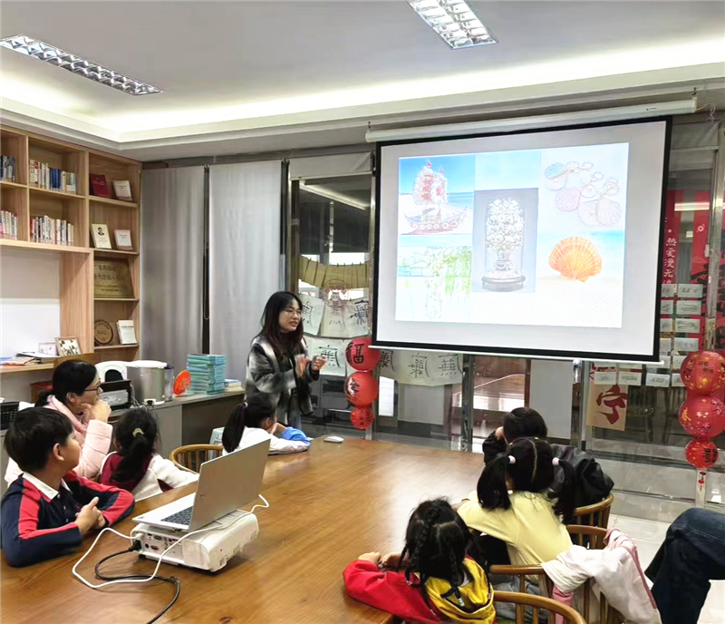 活动开始,志愿者通过生动的PPT讲解有关“贝”字的起源、意义及贝壳的特点,孩子们眼睛里闪烁着对贝类的好奇及求知的渴望,随后,志愿者为大家示范贴盘画的制作步骤和技巧,孩子们便迫不及待地动起手来,他们化身成为一个个小小设计师,五彩斑斓的贝类在他们手下很快便组成一幅幅灵动立体的海洋画卷,大家分享自己的灵感和创意,感受创作带来的无穷乐趣。