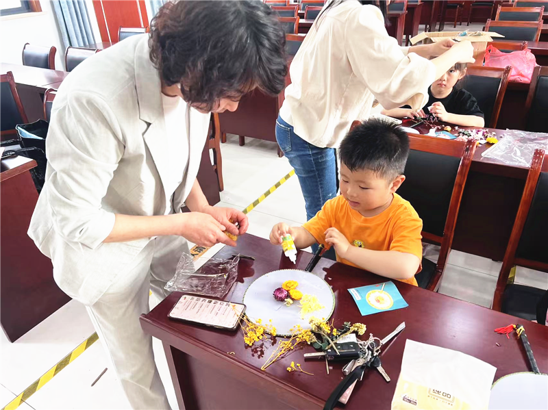 巾帼志愿者向大家介绍花扇的历史文化背景和制作技巧,并展示精美的花扇作品。孩子们和家长一起挑选心仪的干花,在空白的扇面上精心构图,用胶水将干花粘贴成各种形状,创作出独一无二的花扇作品。孩子们充分发挥想象力,家长们在一旁耐心指导和协助,共同完成了一幅幅充满爱意和创意的作品。