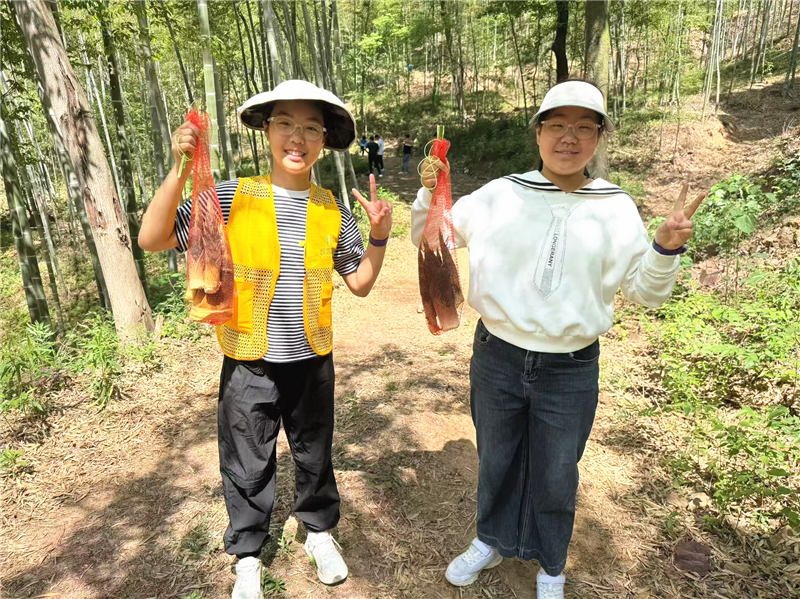 活动当日,春雨初霁的竹林里,“竹林寻鲜,挖笋挑战”环节正式开启。孩子们手持小锄头、网兜,踩着湿润的泥土穿梭于竹林间,目光紧盯地面微微隆起的土包——那是春笋破土的信号。当挖到一根饱满的春笋,孩子们欢呼雀跃,脸上洋溢着收获的喜悦。巾帼志愿者引导孩子们观察竹林的生态环境:“看,这些春笋都长在腐殖质厚的地方,竹子喜欢疏松透气的土壤。”孩子们在实践中既体验了劳动的辛苦,也积累了自然知识。