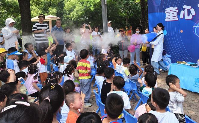 在“六一”国际儿童节来临之际,为进一步弘扬科学精神,推动家庭教育实践,江北新区新庄社区妇联携手辖区幼儿园,在辖区休闲广场组织开展了“童心飞扬科学启航”亲子家庭科普秀特别活动,吸引了约80组亲子家庭热情参与,现场气氛热烈、掌声连连。