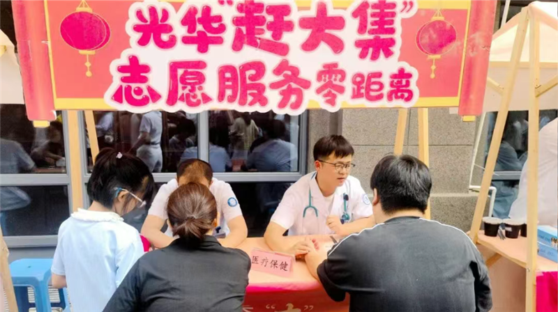 慰问活动结束后,新就业群体前往“光华•赶大集”特色摊位区参与互动。本次摊位分为政策咨询、便民服务、医疗保健、爱心集市四个区域,为新就业群体提供中医健康问诊、血压测量、心理疏导、中暑急救技能学习、劳动权益保障咨询等服务。“平时一直开网约车没时间体检,今天借此机会检查一下身体,这样的活动真是特别贴心。”一名车融汇的员工开心地表示。
