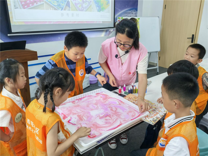 暑托班开展非遗水拓画体验活动,志愿者耐心讲解非遗水拓画“以水为纸、以彩为墨”的千年技艺。孩子们跃跃欲试,将颜料滴入水中勾画纹理,拓印出五彩斑斓的图案,在创作中感受传统文化的魅力,让传统技艺浸润童心。