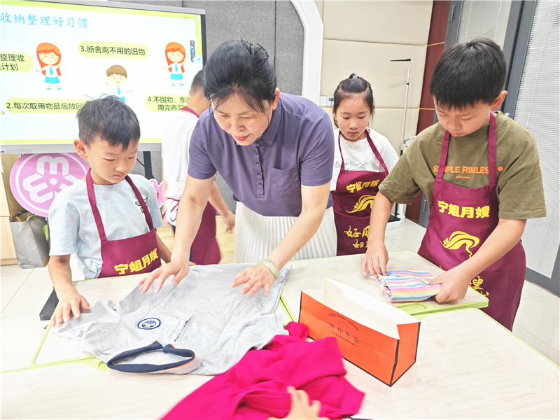 课堂上,来自“俏妈妈”仙林街道“宁姐月嫂”家政服务社区工作站的专业老师用引人入胜的方式讲解了收纳的基本常识和秘诀,并特别传授了易于儿童记忆的收纳口诀。当进入动手实操环节时,原本安静的氛围瞬间活跃起来——“课本式叠衣”“卷筒叠衣”,尤其是充满趣味的“一秒折衣法”,引发了孩子们的浓厚兴趣。孩子们争先恐后登台实践,现场动手体验,将几秒前还散乱的衣服瞬间折得整齐又紧凑。家长们也不甘落后,兴致勃勃参与互动,认真学习家庭整理技巧,与孩子共同沉浸在劳动协作的快乐里。
