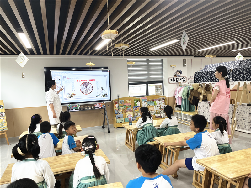 下午的教室里飘散着独特的草木清香,一堂由妇幼保健院精心策划的中医药文化体验课正拉开帷幕。医生为孩子们讲述“四神汤”的故事。“四神汤”源于古老中医智慧,由茯苓、莲子、芡实和山药这四位“守护神”组成。老师详细讲解了它的家常做法——简单清洗后加水慢熬,以及它温和健脾、帮助消化的益处。孩子们听得入神,原来日常食物里藏着这样守护身体的小秘密。紧接着,在医生的带领下,大家开始学习简单实用的“儿童保健穴位操”。伴随着轻松的口令,“找到小鼻子两边,用小手轻轻揉一揉,这是我们的‘迎香穴’……”孩子们伸出稚嫩的手指,认真地在自己和邻座小伙伴的小脸蛋上寻找着穴位,模仿着老师的样子轻轻揉捏。这看似简单的动作,长期坚持却能起到调理脾胃、增强体质的作用,让孩子们在趣味互动中初步领略了中医穴位保健的神奇。