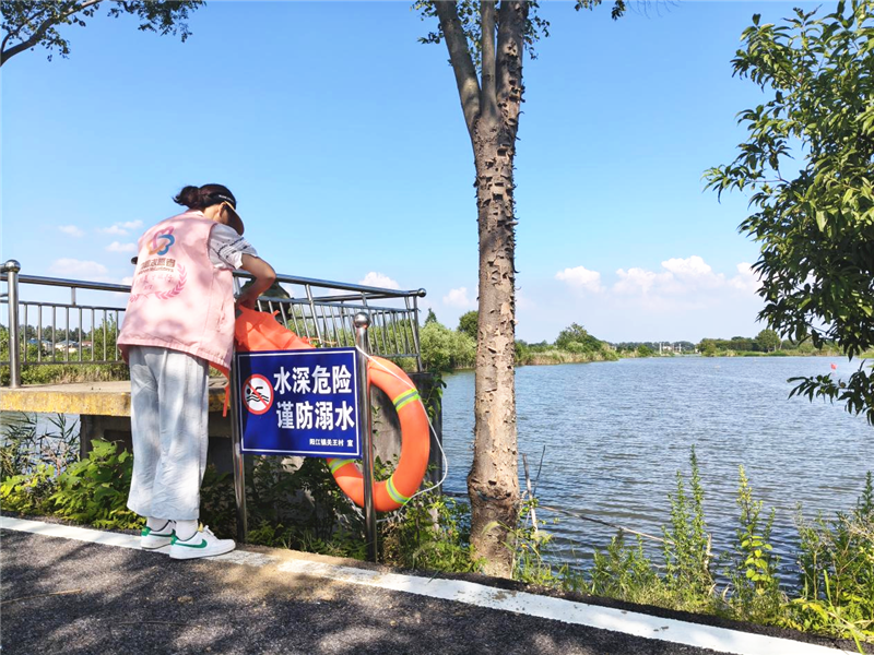 针对夏季群众爱去的“水边”区域,志愿者更是加大宣传力度。高温下,志愿者在辖区每一条沟汊旁竖起了“水深危险•谨防溺水”的警示牌,同时在警示牌两侧悬挂救生圈及救生衣等“安全铠甲”。