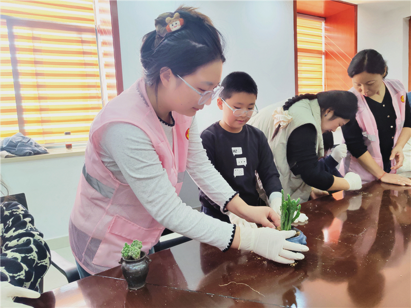 在“指尖绿意”手工盆栽环节,志愿者先向亲子家庭介绍多肉植物的品种、生长习性及养护技巧,随后演示盆栽制作步骤:从挑选花盆、铺设陶粒,到填充营养土、栽种多肉,每一步都讲解得细致入微。家长与孩子默契配合,打造出独一无二的“迷你小花园”。活动现场,孩子们认真专注的模样、家长耐心指导的身影,构成了一幅温馨的画面。完成制作后,孩子们小心翼翼地捧着自己的盆栽,兴奋地向老师和小伙伴展示,脸上满是成就感。