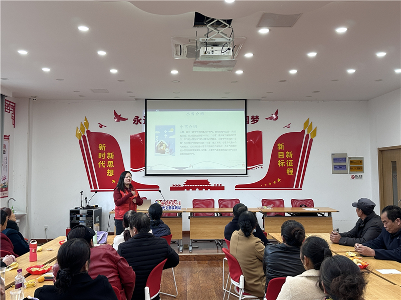 在芦韵E家红石榴家园,志愿者通过生动讲解图文并茂的PPT,带领居民深入了解有关冬季节气的由来、节气的文化内涵以及“腌腊肉、储冬菜”等传统习俗。大家听得津津有味,不时与身边邻居轻声交流,有居民感慨道:“可不是嘛,以前这时候,家家户户阳台都挂着咸肉,家里囤满了白菜萝卜”,现场氛围温馨而亲切,节气文化的韵味在互动与共鸣中慢慢浸润人心。