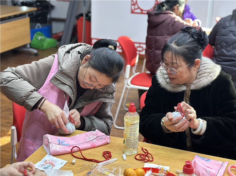 “善邻纳福”香囊DIY活动备受欢迎,志愿者耐心地为居民提供手把手指导,协助大家搭配松柏叶、肉桂、陈皮等温润的香料。不一会儿,一个个小巧精致的香囊陆续完成。大家手捧着自己亲手制作的香囊,脸上洋溢着满心的欢喜。徐奶奶说:“把这个香囊带回家悬挂起来,可以祈福暖身呢!”