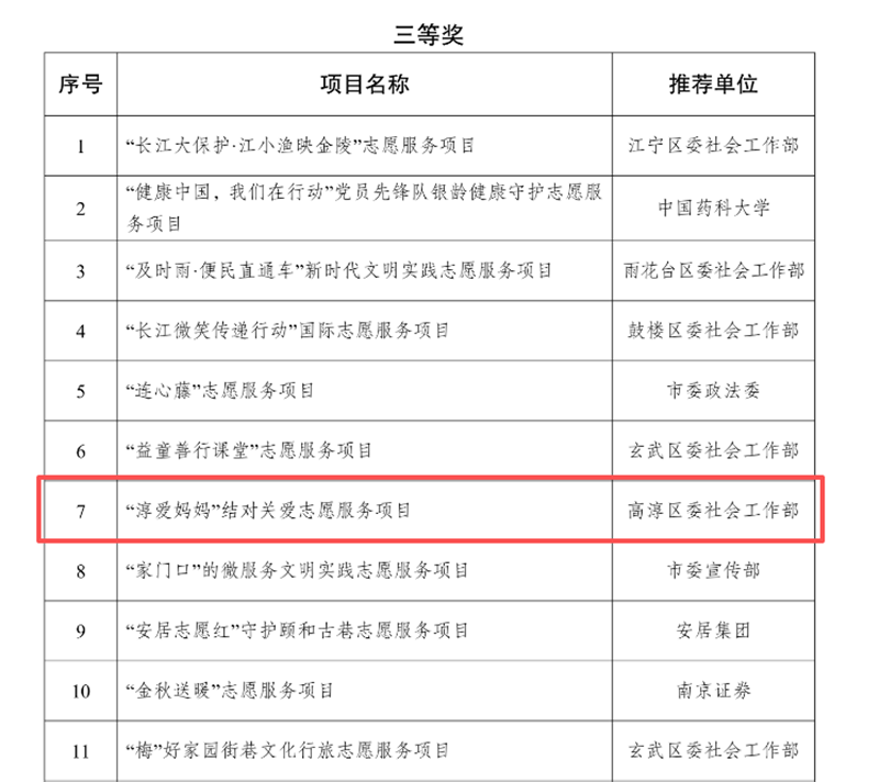 近日,由南京市委社会工作部组织的2025年南京市志愿服务项目大赛结果揭晓。经过广泛发动、逐级推荐、集中评审、社会公示等程序,由高淳区妇联实施的“‘淳爱妈妈’结对关爱志愿服务项目”获评三等奖。