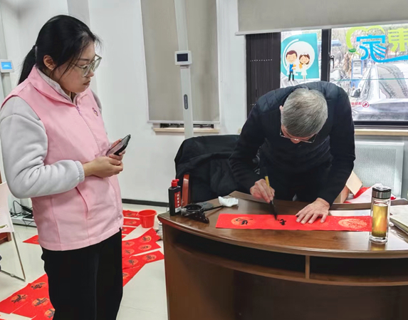 活动中,辖区居民闻讯而来,围在书桌旁,一边欣赏书法创作的魅力,一边轻声念诵“福”字蕴含的美好期许,现场欢声笑语不断。