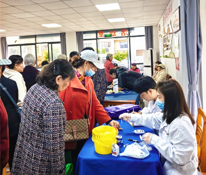 早晨8点,医护人员提前在悦心居家活动室搭起义诊台,为老人提供免费的血压测量、血糖检测、心肺听诊等基础健康检查服务。结合春季特点,医护人员围绕春季高发的呼吸道疾病、老年骨关节健康等问题,开展健康咨询和科普,为指标异常老人提供个性化饮食、用药及运动指导,引导老人树立科学的健康管理理念。除基础检测外,活动还特别设置了口腔健康筛查和视力筛查专区,为老人排查龋齿、牙周病等常见口腔问题,提供假牙护理指导及视力保护建议。