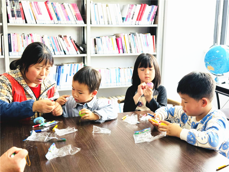 志愿者带领孩子们阅读《习近平讲故事(少年版)》“英雄出少年”篇章,生动讲述“半条被子”“马背上的小红军”等红色革命故事,引导孩子们感悟革命先辈的奋斗精神,厚植爱国情怀。在“彩蛋涂鸦”环节,孩子们在蛋模上尽情创作,用彩笔为动物、花朵等图案涂色。涂鸦完成后,孩子们轮流上台,手持自己的彩蛋模型,即兴讲述小故事,稚嫩的童声与缤纷的彩蛋相映成趣,现场满是欢声笑语。
