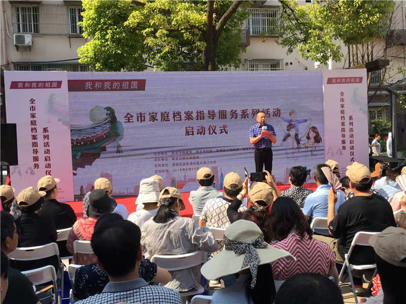 6月11日上午,在建邺区莫愁湖街道水西门社区,由南京市妇联、南京市档案馆、南京市家庭建设指导中心社区联合举办的“庆祝新中国成立70周年 ‘我和我的祖国’——家庭档案指导服务系列活动启动仪式” 。本次活动系2019南京邻里文化节、“6·9”国际档案日宣传周系列活动之一,来自全市各区家庭建档中心志愿者及各区群众代表等近百人参加活动。